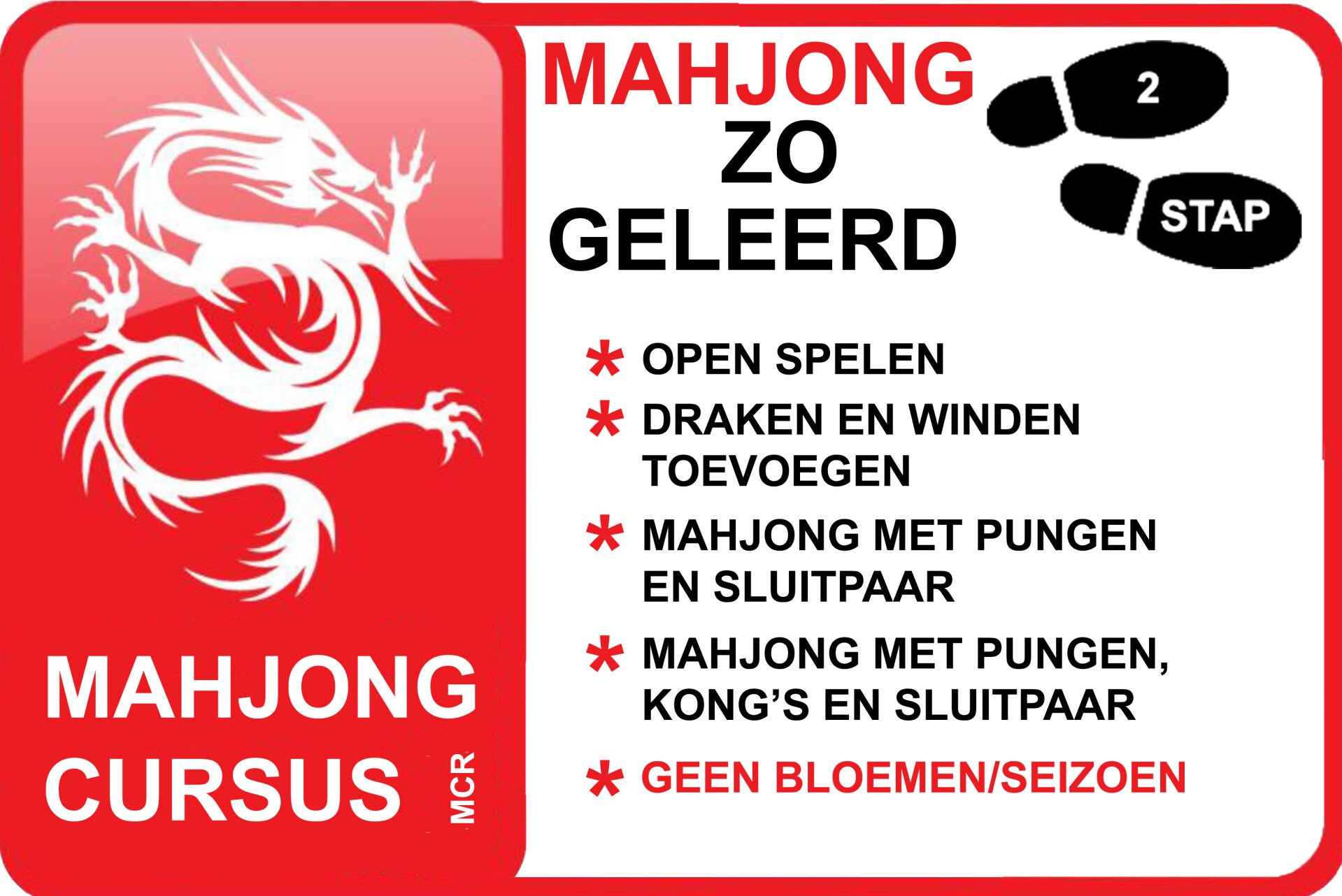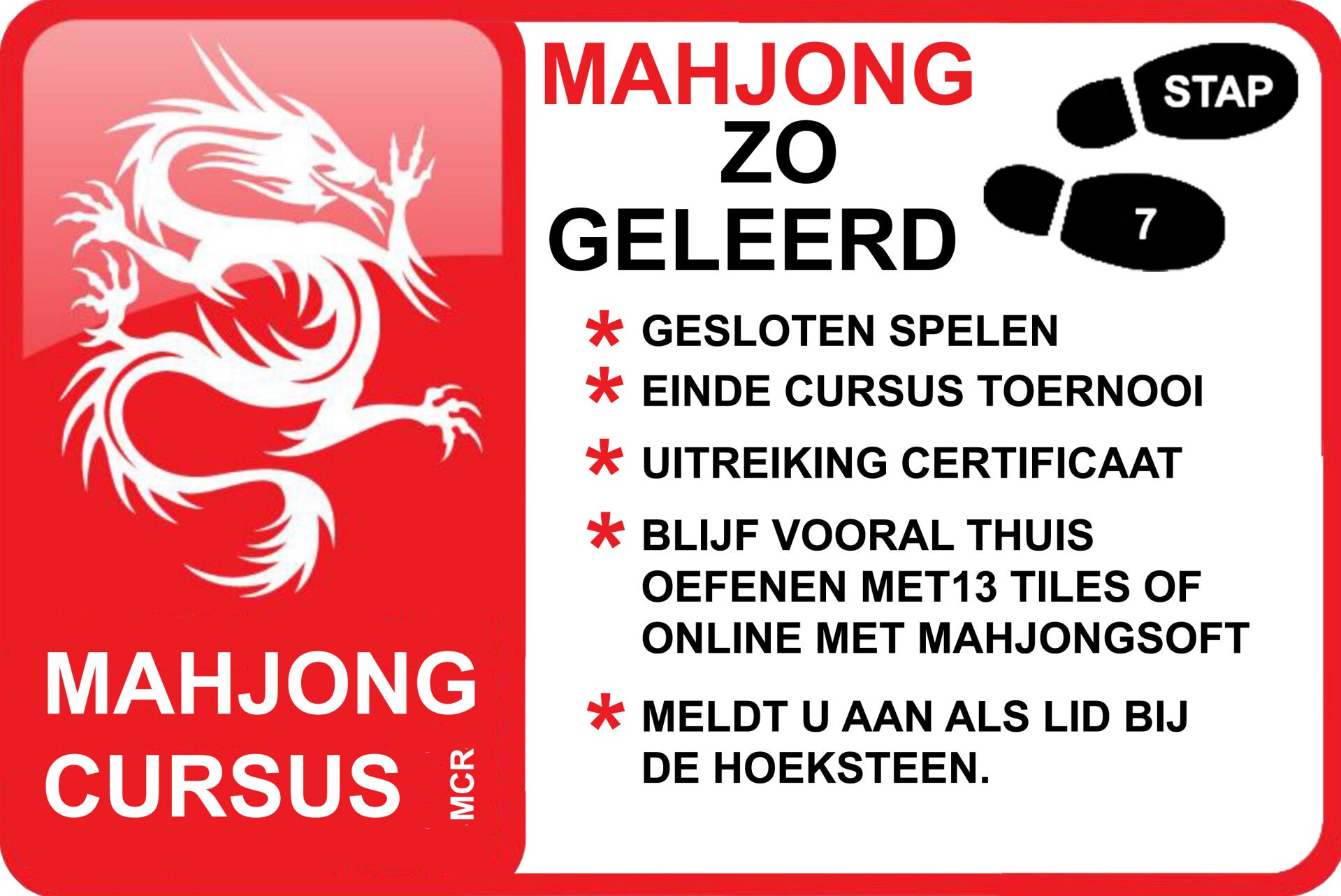 Door deel te nemen aan het 7-stappenplan leer je het spel in al zijn facetten. Je ontwikkelt een compleet Mahjong inzicht dat je helpt strategisch te denken en te winnen.
